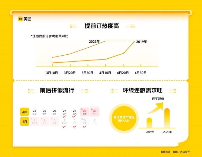 此外,一些新趨勢也在發(fā)生。一是前后拼假流行,美團數(shù)據(jù)顯示,在法定假期之外,4月27日和5月6日,也將迎來兩個入住小波峰;二是環(huán)線連游需求旺,消費者大多會游玩多個城市,以獲取豐富、深度的假期體驗,熱門環(huán)線上的城市住宿量迎來同步上漲,美團上預(yù)訂2個以上城市住宿的用戶占比較2019年近乎翻倍。