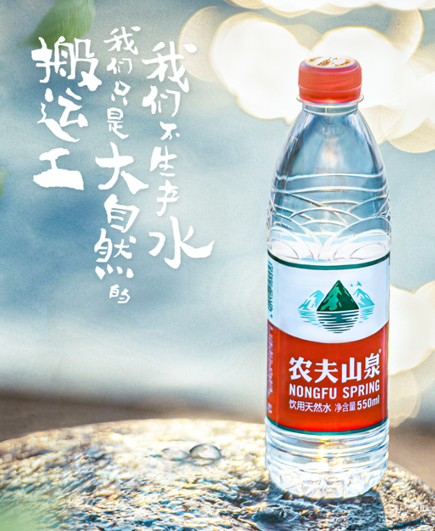 農夫山泉認為,只有好的天然水源才能生產出優(yōu)質的瓶裝飲用水,含有天然礦物元素的飲用水,最符合人體需求,任何人工水都難以比擬。