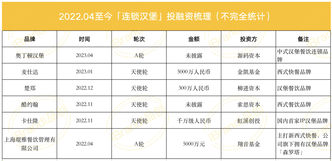 據(jù)iBrandi品創(chuàng)不完全統(tǒng)計,自2022年4月至今的一年時間里,共有6個漢堡連鎖相關(guān)品牌完成融資,且多以中式漢堡為主。
