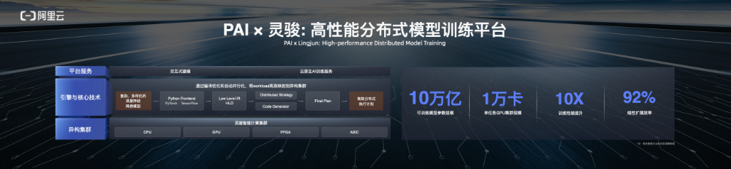 通過PAI&靈駿,搭建高性能分布式模型訓(xùn)練平臺(tái),用戶可訓(xùn)練10萬(wàn)億參數(shù)大模型,使得上萬(wàn)張顯卡聯(lián)合訓(xùn)練超大模型,提供接近10倍性能提升。