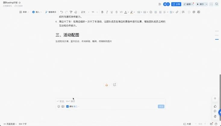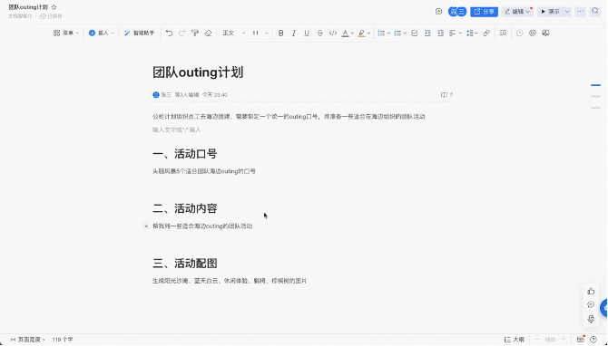 在釘釘文檔里,可以通過輸入需求,讓釘釘進(jìn)行內(nèi)容創(chuàng)作。