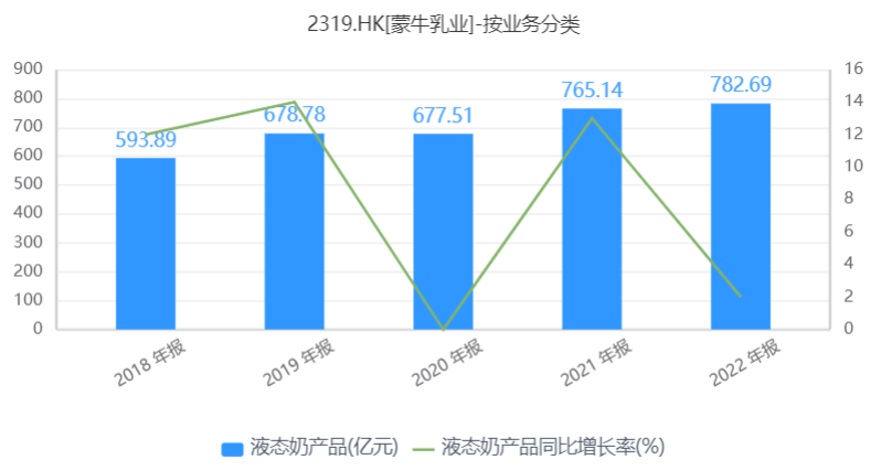 2022年全年,蒙牛液態(tài)奶業(yè)務(wù)實現(xiàn)營收782.69億元,同比微增2.3%,收入中占比84.5%;奶粉業(yè)務(wù)共實現(xiàn)營收38.62億元,同比下滑近22%,收入占比約為4.2%;冰淇淋業(yè)務(wù)實現(xiàn)營收56.52億元,同比大增33.3%,收入占比約為6.1%;奶酪及其他產(chǎn)品營收為48.1億元,同比增長接近100%,主要受妙可藍多并表影響,收入占比約為5.2%。