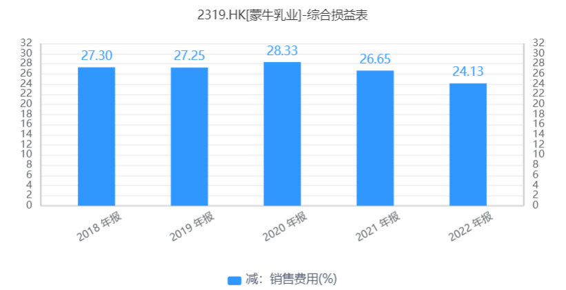 面對市場環(huán)境的疲軟,蒙牛乳業(yè)在費用投入上進行了控制。年報顯示,2022年全年,蒙牛銷售費用支出為223.47億元,同比減少4.9%,收入占比由26.6%下降至24.1%。其中,產(chǎn)品和品牌宣傳及行銷費用大幅減少23.8%至54.95億元。