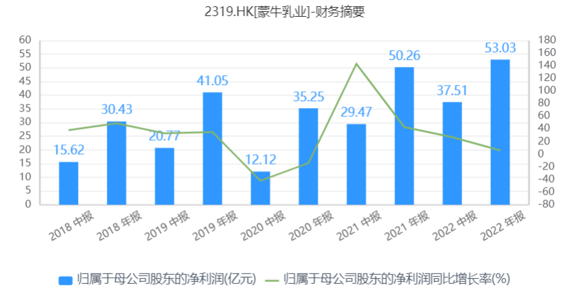 此前的半年報顯示,2022年上半年,蒙牛共實現(xiàn)凈利潤37.51億元,同比增長27%。由此計算,蒙牛2022年下半年凈利潤僅為15.52億元,較上年同期(20.79億元)減少5.27億元。由于下半年凈利潤的縮水,蒙牛2022年全年凈利潤增速大幅拉低至5.5%。