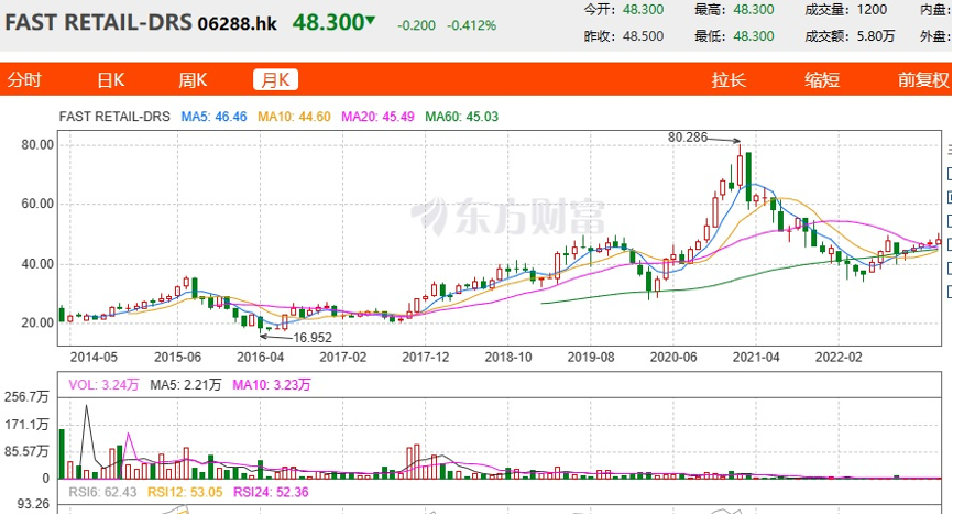 2021年2月,市值曾突破10萬億日元(相當(dāng)于5100億元人民幣),成為全球服裝行業(yè)市值最高企業(yè)。