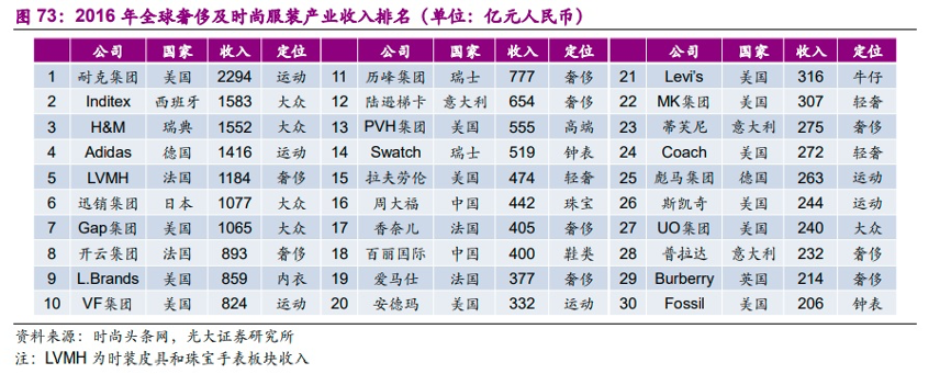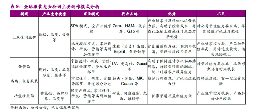 總結(jié)包含優(yōu)衣庫在內(nèi)的國外服裝龍頭成長,我們發(fā)現(xiàn)龍頭主要誕生于大眾休閑服飾、高端奢侈服飾和功能性服飾三大領(lǐng)域。