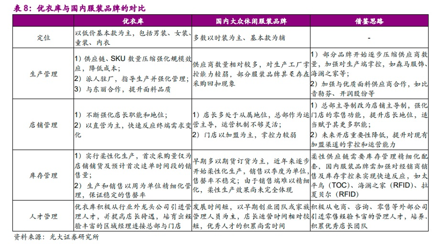 SPA模式改革使得公司產(chǎn)品優(yōu)勢由低價真正轉(zhuǎn)為高性價比,并輔以店鋪、庫存、人才管理的革新,奠定收入長期成長的基礎(chǔ)。