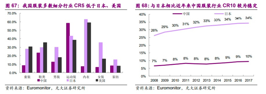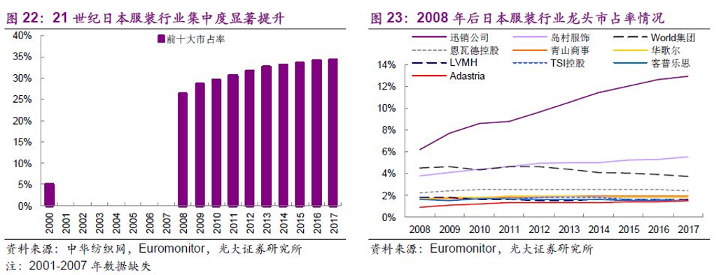 體現(xiàn)在行業(yè)集中度上:2000年,日本前十大服裝企業(yè)銷售額為1.36萬億日元,僅占全行業(yè)的4.99%;而到了2017年,這一比例提升為34.30%。其中,優(yōu)衣庫母公司迅銷占比13%。