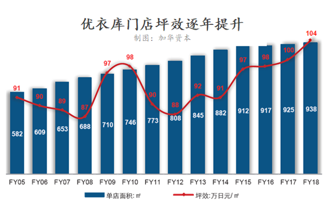 /截至2018財年,優(yōu)衣庫日本直營體系中,大店占比提升至27.4%,平均門店面積提升至938㎡,坪效也提升至104萬日元/㎡(相當(dāng)于5.366萬人民幣)的歷史高點。