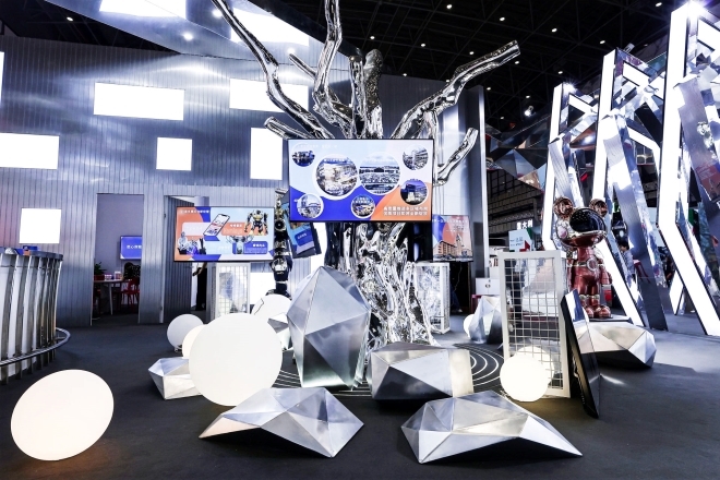 此次王府井集團展位融入了大量科技元素與藝術(shù)裝置元素,并首度攜手國潮IP星際熊,共同打造潮酷的生活空間。