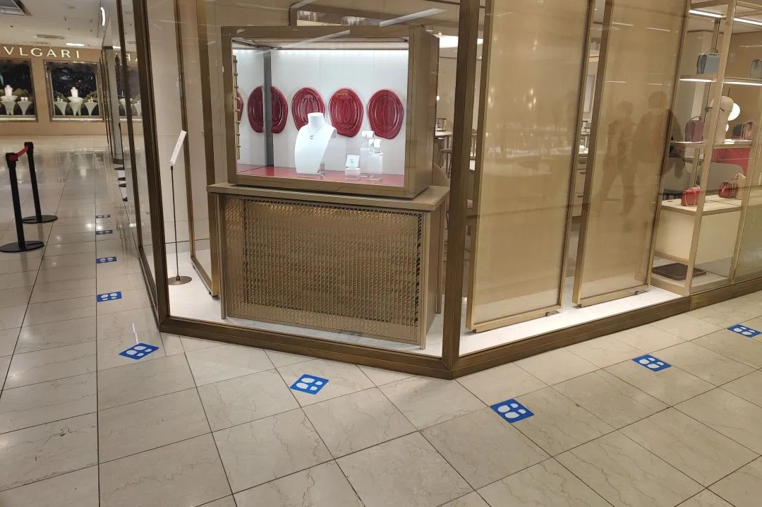 比如在奢侈品店門(mén)口,用小腳印替代國(guó)內(nèi)常見(jiàn)的長(zhǎng)長(zhǎng)的一米欄,引導(dǎo)出了排隊(duì)的路徑。上圖中間還可以觀察到,腳印地貼的對(duì)齊細(xì)節(jié),處理的非常到位。