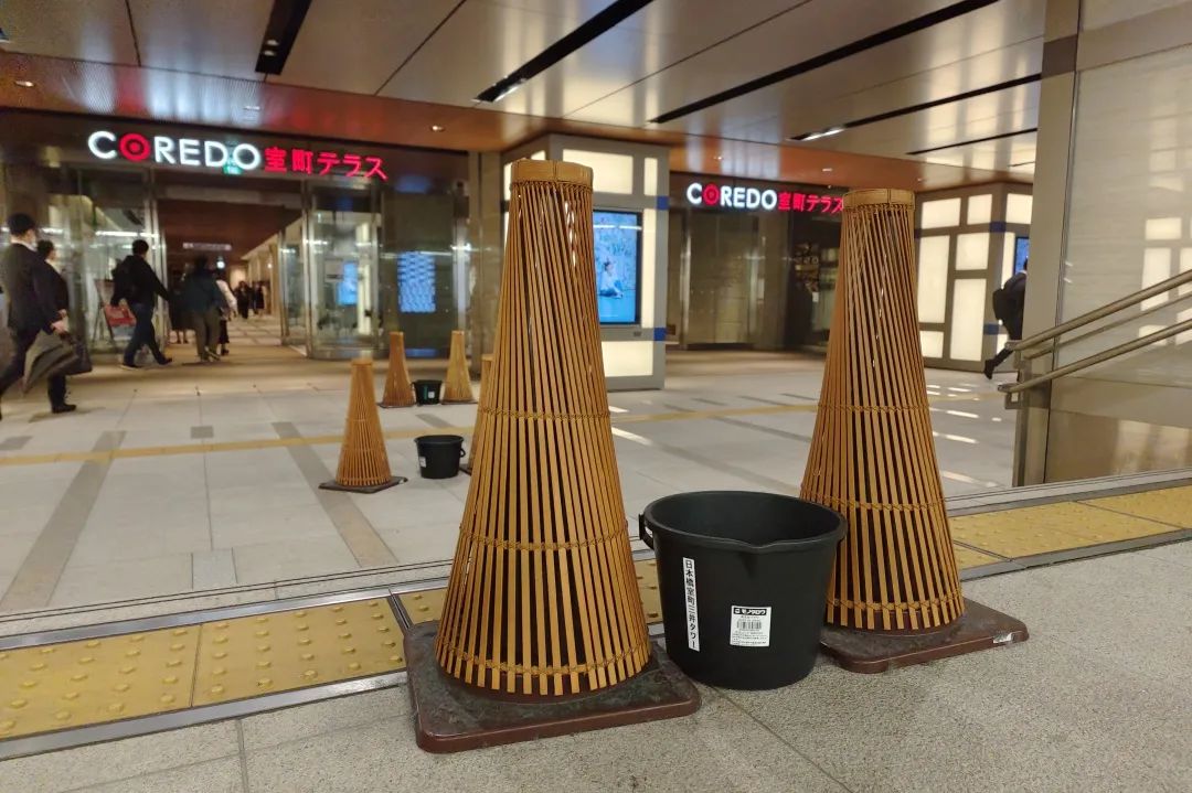 似乎漏水是所有商場(chǎng)都解決不了的痛,日本也不例外?但日本在裝接水桶旁邊,標(biāo)識(shí)區(qū)域的雪糕筒上,額外做了點(diǎn)裝飾設(shè)計(jì),就讓它顯得不那么丑,且更具有商場(chǎng)特色了。