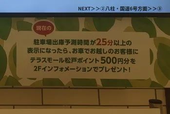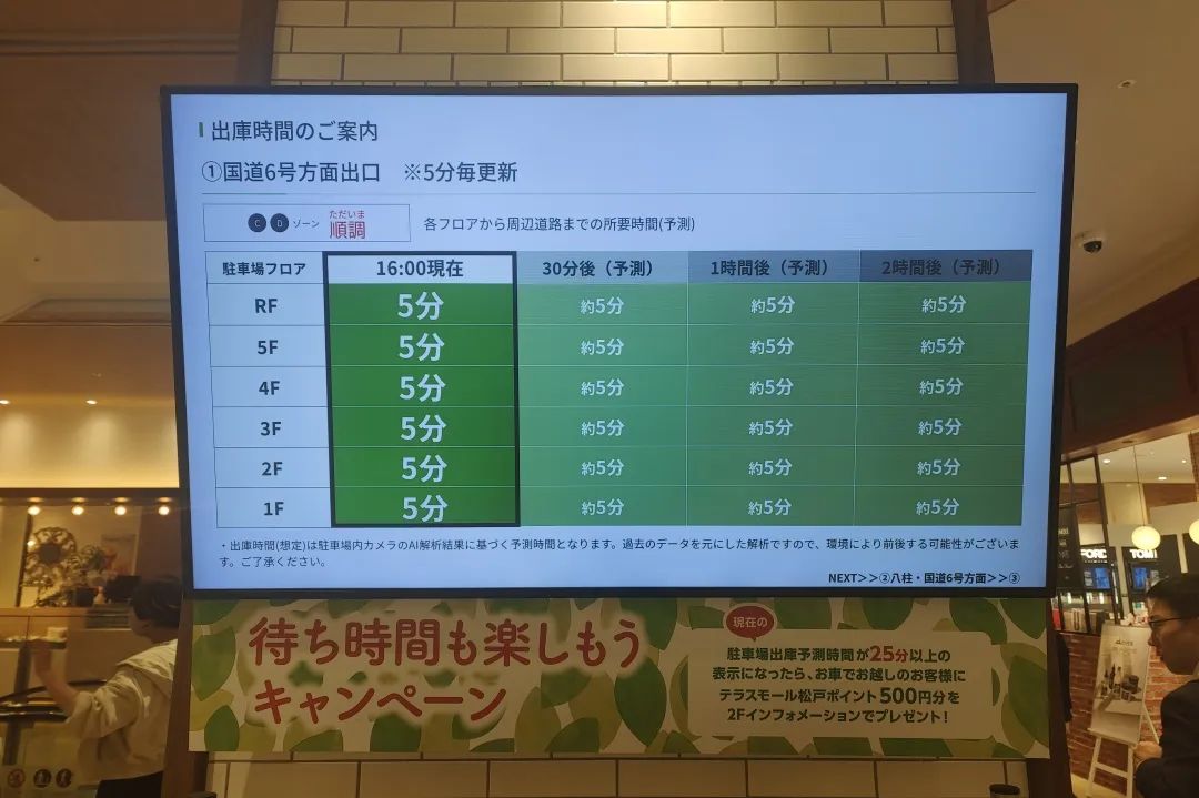 在松戶的Terrace Mall,管理團(tuán)隊(duì)給我們介紹了一處非常人性化的服務(wù)。由于項(xiàng)目客流較大,高峰期容易發(fā)生進(jìn)出車(chē)流擁堵的情況。項(xiàng)目團(tuán)隊(duì)針對(duì)這種現(xiàn)象,結(jié)合場(chǎng)內(nèi)智能停車(chē)系統(tǒng)的監(jiān)控和運(yùn)營(yíng)的歷史經(jīng)驗(yàn)數(shù)據(jù),在各服務(wù)臺(tái)、出入口設(shè)置了“出庫(kù)時(shí)間提醒”。