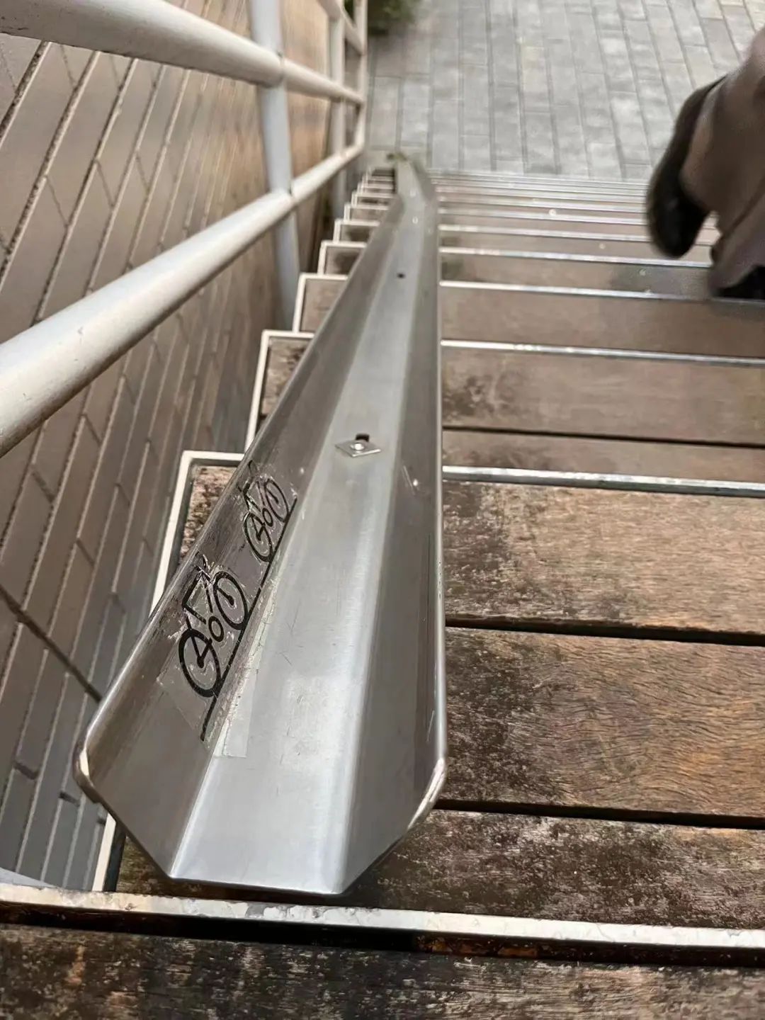 服務(wù)的細(xì)心程度,不止于針對(duì)開(kāi)車(chē)族、輪椅族。我們?cè)谌毡窘诸^的人行臺(tái)階上,發(fā)現(xiàn)了一處為方便推行自行車(chē)而設(shè)置的金屬軌道,用最小的空間成本解決了自行車(chē)上坡的難題。