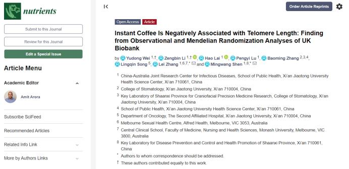 一項(xiàng)近期發(fā)表在Nutrients期刊上的研究就指出,常喝咖啡,特別是速溶咖啡,會(huì)縮短端粒長(zhǎng)度,減少壽命。這篇論文中文名譯作“速溶咖啡與端粒長(zhǎng)度呈負(fù)相關(guān):英國(guó)生物樣本庫(kù)的觀察和孟德爾隨機(jī)分析發(fā)現(xiàn)”。