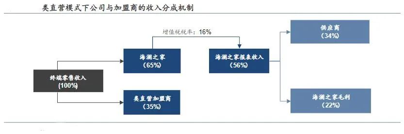 而在下游直營(yíng)加盟的部分,加盟商只需提供店面的租金和裝修費(fèi)用就能“坐享其成”,海瀾之家則負(fù)責(zé)店面形象、員工和貨品的管理,商品完成銷售后,加盟店與海瀾之家按比例分成營(yíng)業(yè)收入。