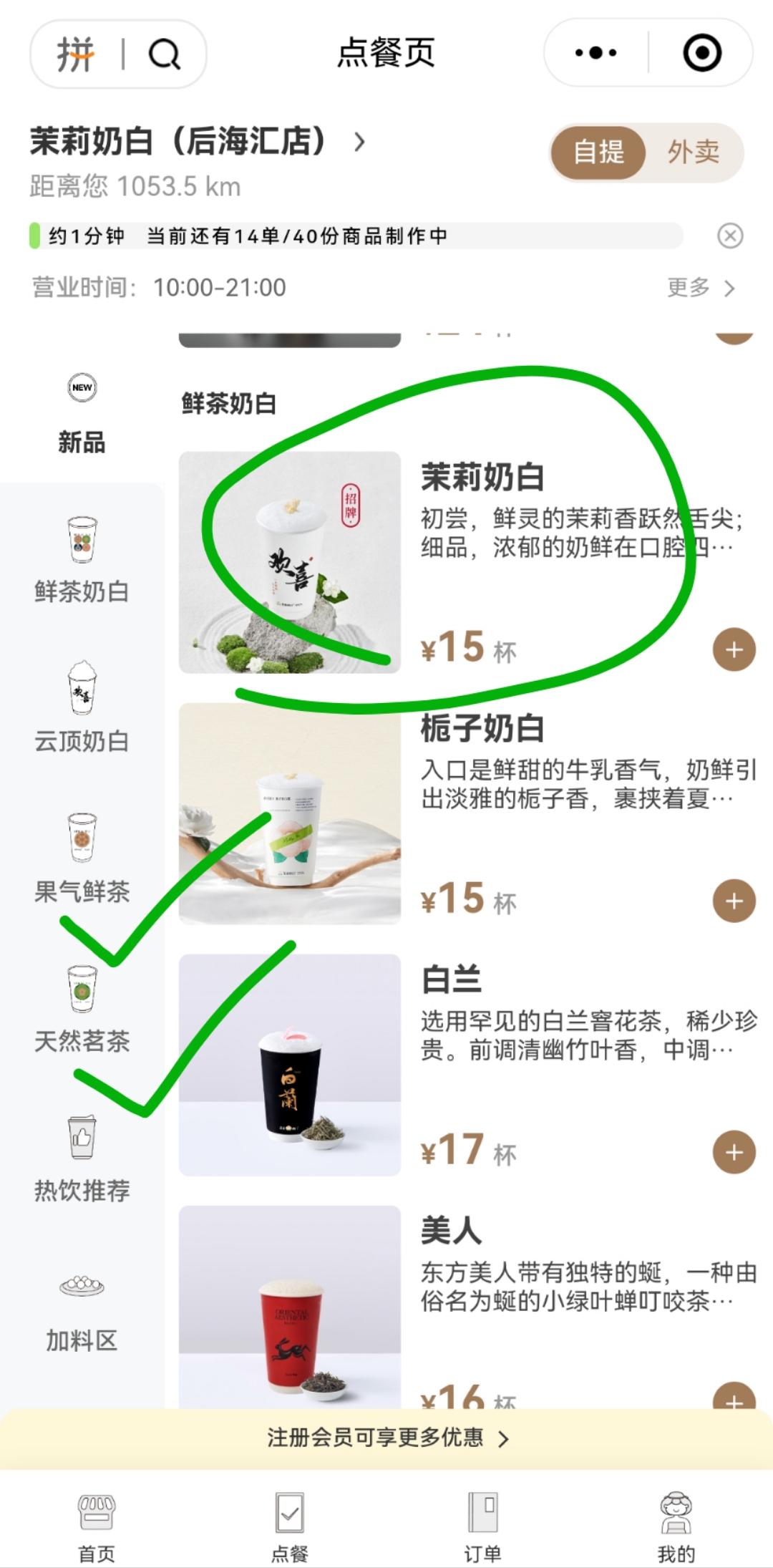 從茉莉奶白點(diǎn)單小程序可見(jiàn),其有超過(guò)30個(gè)SKU,覆蓋了市面鮮奶茶、鮮果茶、純茶等品類(lèi)。而點(diǎn)單欄目重點(diǎn)劃分為三個(gè):鮮茶/云頂奶白(花香茶飲)、果氣鮮茶、天然茗茶等三大類(lèi)。整體價(jià)格在15-20元區(qū)間,以爆款單品茉莉奶白(同店名茶飲)為例,售價(jià)15元/杯,占據(jù)了整體銷(xiāo)量的30%-40%。