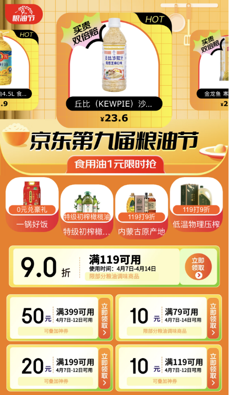 4月7日,京東超市第9屆糧油節(jié)正式開啟,本次糧油節(jié)持續(xù)超過一周,將在4月14日結(jié)束。