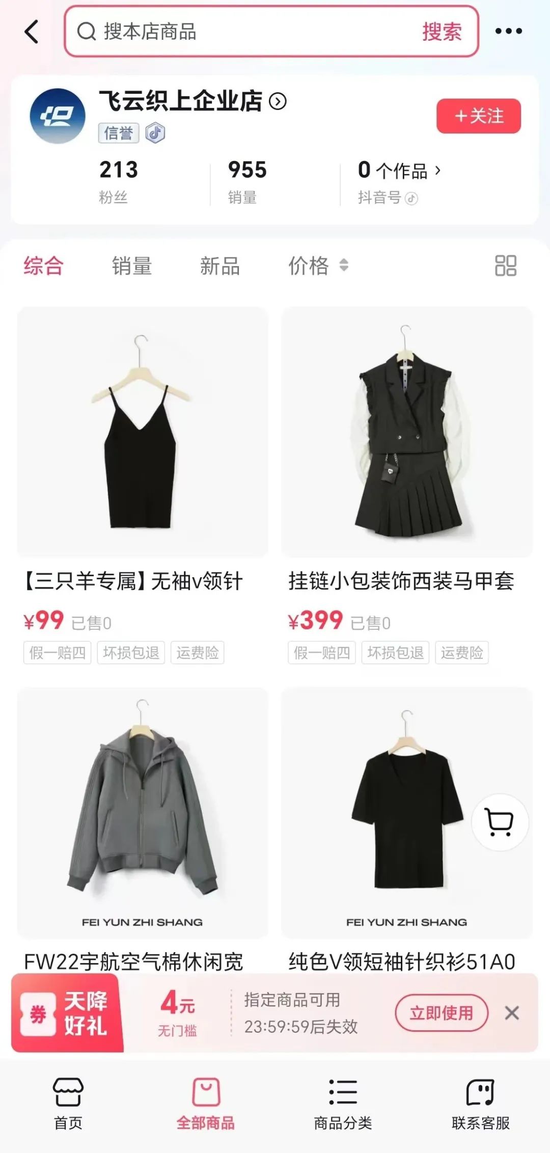 近期,抖音組建了一個(gè)自營(yíng)服飾團(tuán)隊(duì),并在APP內(nèi)推出一家名為“飛云織上”的店鋪。