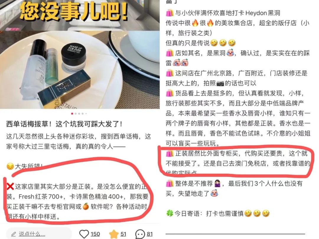 其中有網(wǎng)友在探店西單的話梅后發(fā)布筆記稱,“這家店里(彩妝)其實(shí)大部分是正裝,沒什么便宜的正裝,那我要買正裝為什么不去專柜官網(wǎng)或者電商平臺(tái)呢?……護(hù)膚產(chǎn)品基本上有小樣但價(jià)格偏貴,正裝看不出價(jià)格上或者服務(wù)上的任何優(yōu)勢(shì),另外有些沐浴品牌在屈臣氏和莎莎都有,而且經(jīng)常折扣,何必在這里買?”并表示,“我身邊基本上大家都是一副來都來了的失望臉。”