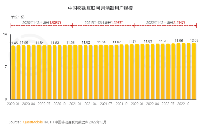 QuestMobile披露的《2022中國移動互聯(lián)網(wǎng)年度大報告》顯示,截至2022年末,中國移動互聯(lián)網(wǎng)月活規(guī)模為12.03億元,對比2021年末的11.74億,僅增長2.47%。這意味著,中國移動互聯(lián)網(wǎng)已經(jīng)完成了下沉觸達(dá),沒有更多的增量流量紅利可供互聯(lián)網(wǎng)企業(yè)挖掘。