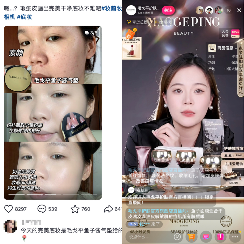 獨特的線下“換頭術(shù)”課程,以及跟線下柜臺積累的“以妝帶品”銷售方式,也被毛戈平復(fù)制到線上電商,用來進行用戶種草。
