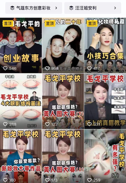 為給培訓機構(gòu)加大曝光率,毛戈平通過在線上打造名師IP為線下引流。目前,在抖音,毛戈平學校最大的個人名師IP是“毛戈平學校總校長汪汪姐”,有19.6萬粉絲,小紅書8.7萬粉絲,她不是別人,正是毛戈平的妻子汪立群。