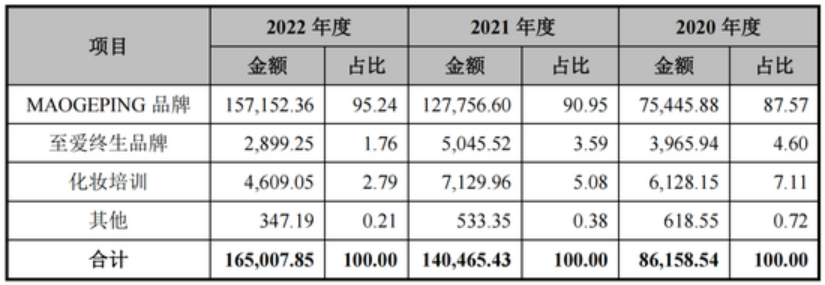 除此之外,毛戈平還在2008年推出面向二、三線城市的女性消費者的“至愛終生”品牌,主打平價、快速化妝,產(chǎn)品有彩妝單品121款,化妝工具13款,護膚單品7款,平均售價在150-260元之間,不過,平價產(chǎn)品并沒有高端線產(chǎn)品受歡迎,2022年僅實現(xiàn)營業(yè)收入2899.35萬元,不及同期“MAOGEPING”的零頭。