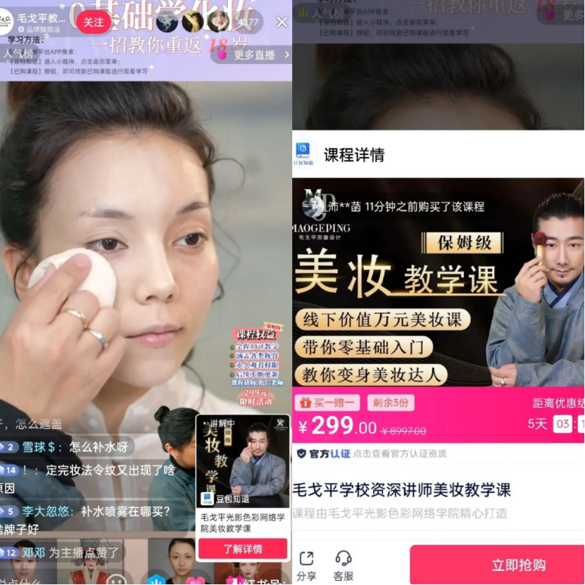 如今在線上,毛戈平學校還開設(shè)了1元拼團網(wǎng)課。比如“原價299/節(jié)的化妝直播課程,現(xiàn)五人成團只需1元”“原價398的課程,用戶可以通過9.9元限量秒殺體驗一部分直播課程”,主要目的也是為線下引流。有學校學員告訴剁主,“我看過這些網(wǎng)絡(luò)課,基本都是線下開學前的預(yù)習課,不收費,線下更多是技能課!