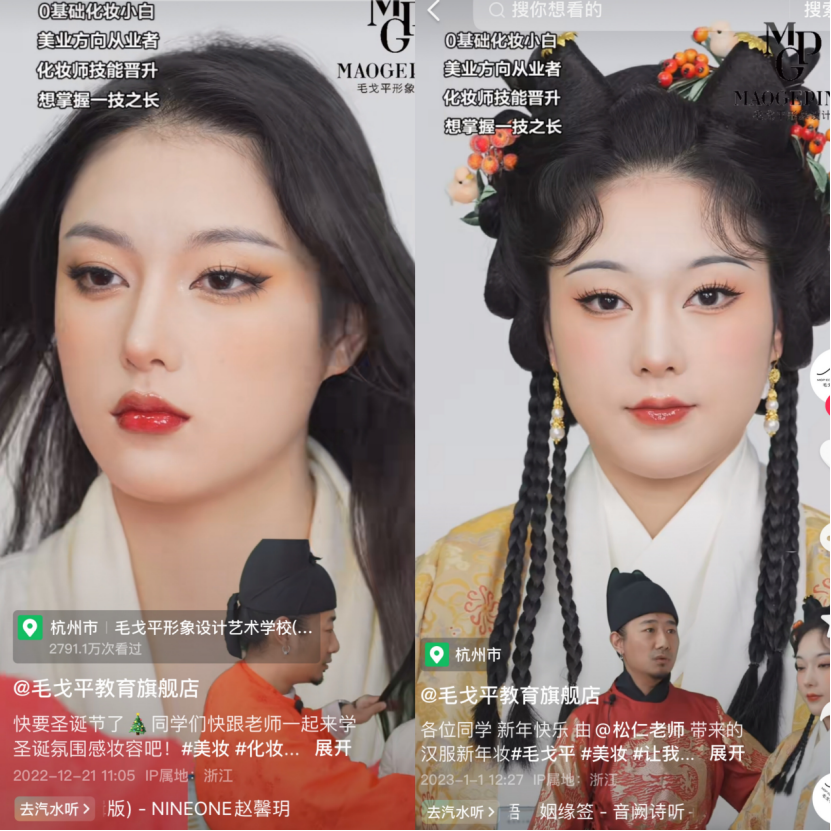 剁主發(fā)現(xiàn),毛戈平線下化妝技能培訓業(yè)務(wù)已經(jīng)有上億的體量,至今,號稱“包教包會”的毛戈平化妝培訓學校,還是社交平臺的熱門話題,不少美妝博主也借此來學習“換頭術(shù)”,幾周學完之后,把成果應(yīng)用到自己的短視頻中,漲粉變現(xiàn)。毛戈平本人也沒閑著,正借助線上流量,把自己的老婆打造成“名師IP”,搶占線下培訓市場份額。