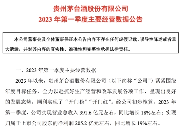報告顯示,經(jīng)公司初步核算,2023年第一季度,貴州茅臺實現(xiàn)營業(yè)總收入391.6億元左右,同比增長18%左右;實現(xiàn)歸屬于上市公司股東的凈利潤205.2億元左右,同比增長19%左右。