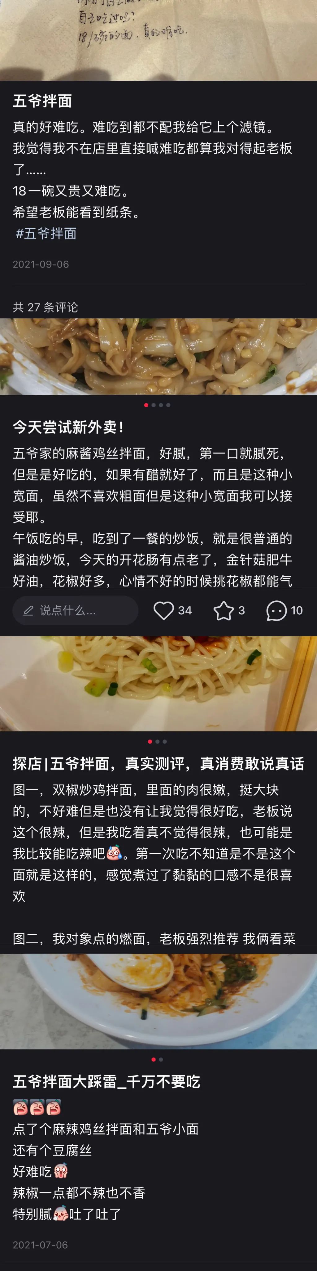 無論是大眾點評,還是被新銳品牌看作營銷圣地的小紅書,“難吃”成了五爺拌面身上最大的標簽之一。