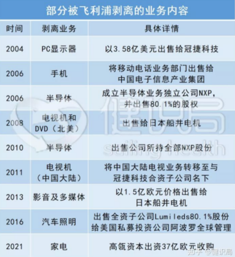 2004年,飛利浦開始逐漸剝離非核心業(yè)務(wù)“斷臂求生”。飛利浦至今已經(jīng)出售了PC顯示器、手機(jī)、半導(dǎo)體、電視機(jī)、影音、汽車照明和家電等業(yè)務(wù)。