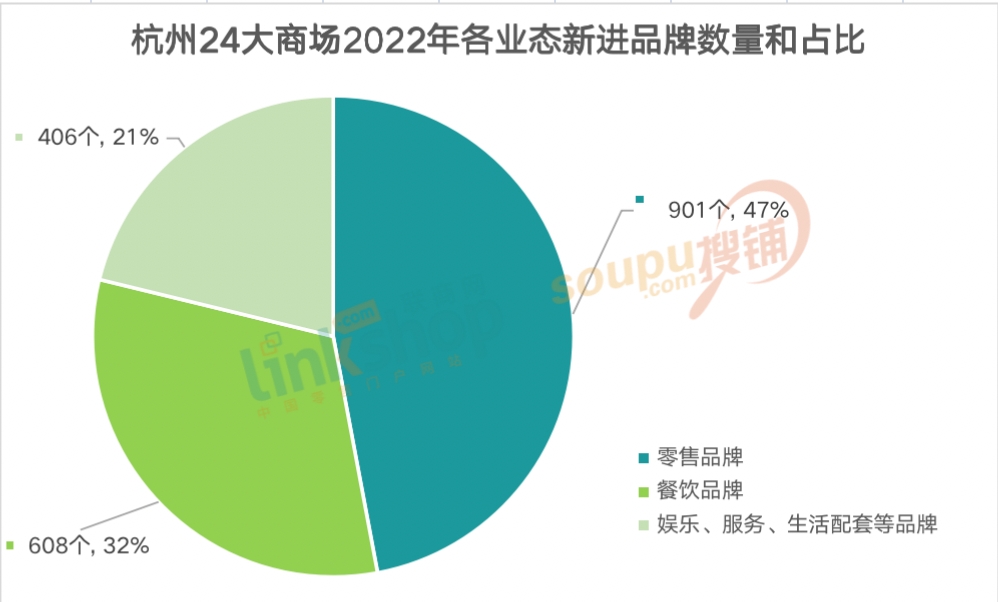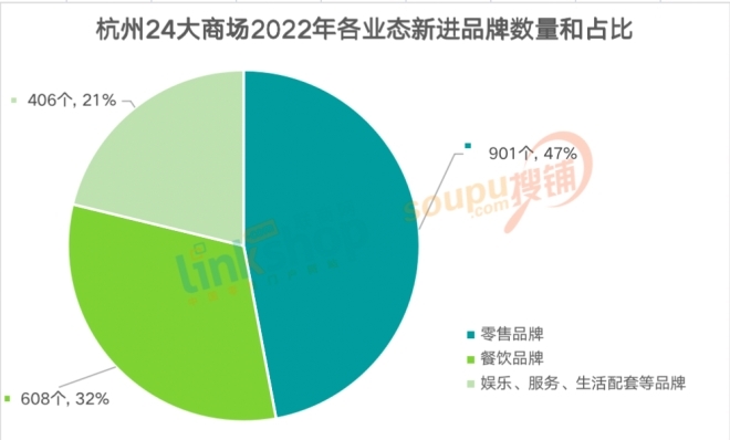 1、從調(diào)整比例看,據(jù)聯(lián)商網(wǎng)零售研究中心監(jiān)測(cè)結(jié)果顯示,24家重點(diǎn)商場(chǎng)去年總計(jì)引進(jìn)新品牌1914家,其中,零售品牌900家,占比47.0%,餐飲品牌608家,占比31.7%,其他業(yè)態(tài)品牌合計(jì)406家,占比21.2%。相比2021年,零售品牌新店的占比有所下降,餐飲品牌占比變化較小,其他業(yè)態(tài)的調(diào)整力度有顯著的增強(qiáng)。