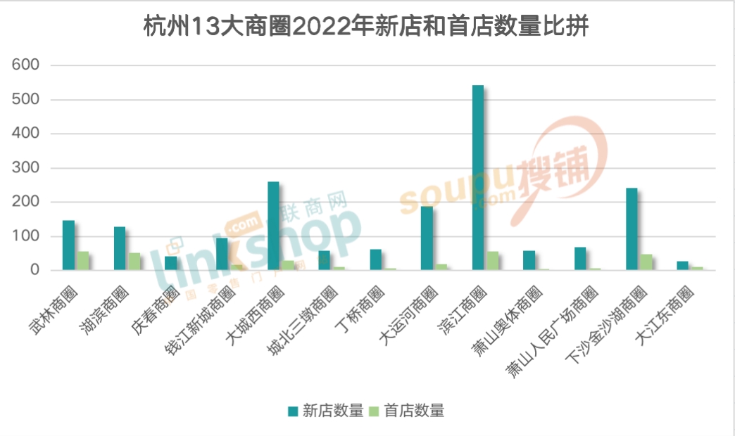 從首店進(jìn)駐情況上看,濱江商圈和武林商圈雙雙以57家首店問(wèn)鼎13大商圈之首,體現(xiàn)了新興區(qū)域商圈和傳統(tǒng)核心商圈的消費(fèi)共振,首店經(jīng)濟(jì)的發(fā)展也處在激烈的角逐中。