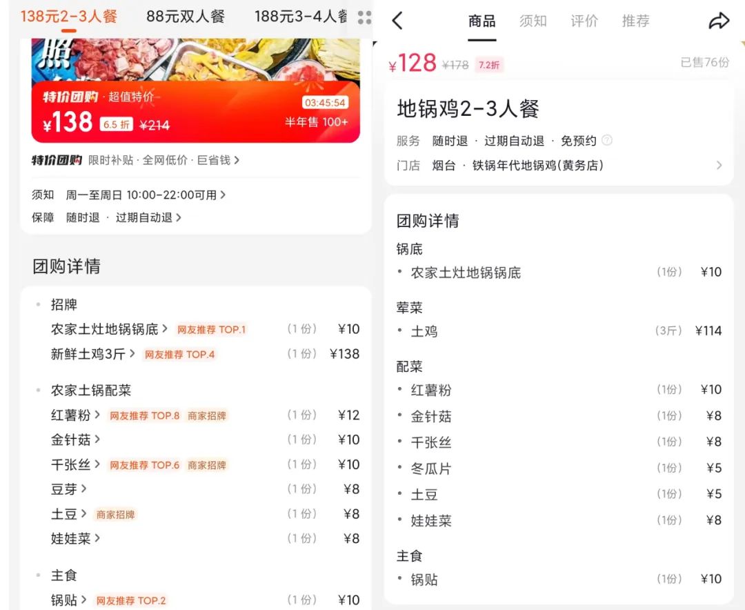 比如皖北地鍋雞煙臺(tái)某店,其美團(tuán)有7個(gè)團(tuán)購(gòu),抖音有8個(gè),其中相同的雙人餐和三人餐套餐,抖音比美團(tuán)便宜10元。