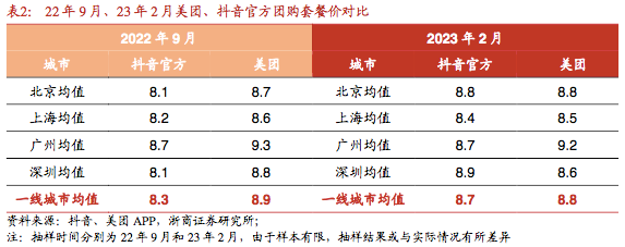浙商證券在今年3月發(fā)布的《美團(tuán)深度報(bào)告:外賣無(wú)虞,到店競(jìng)爭(zhēng)邊際趨緩》也印證了這一點(diǎn),其對(duì)比去年9月和今年2月的抽樣數(shù)據(jù)發(fā)現(xiàn),抖音美團(tuán)的團(tuán)購(gòu)價(jià)差在收窄,抖音:美團(tuán)折扣率從8.3:8.9收窄至8.7:8.8。