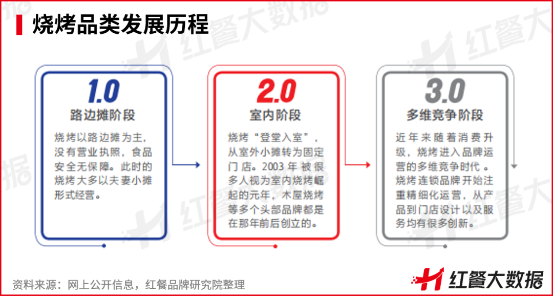 直到近年來,燒烤品類才進(jìn)入連鎖化發(fā)展階段,涌現(xiàn)了不少潛力品牌?偟膩砜,燒烤可以分為以上三個發(fā)展階段。