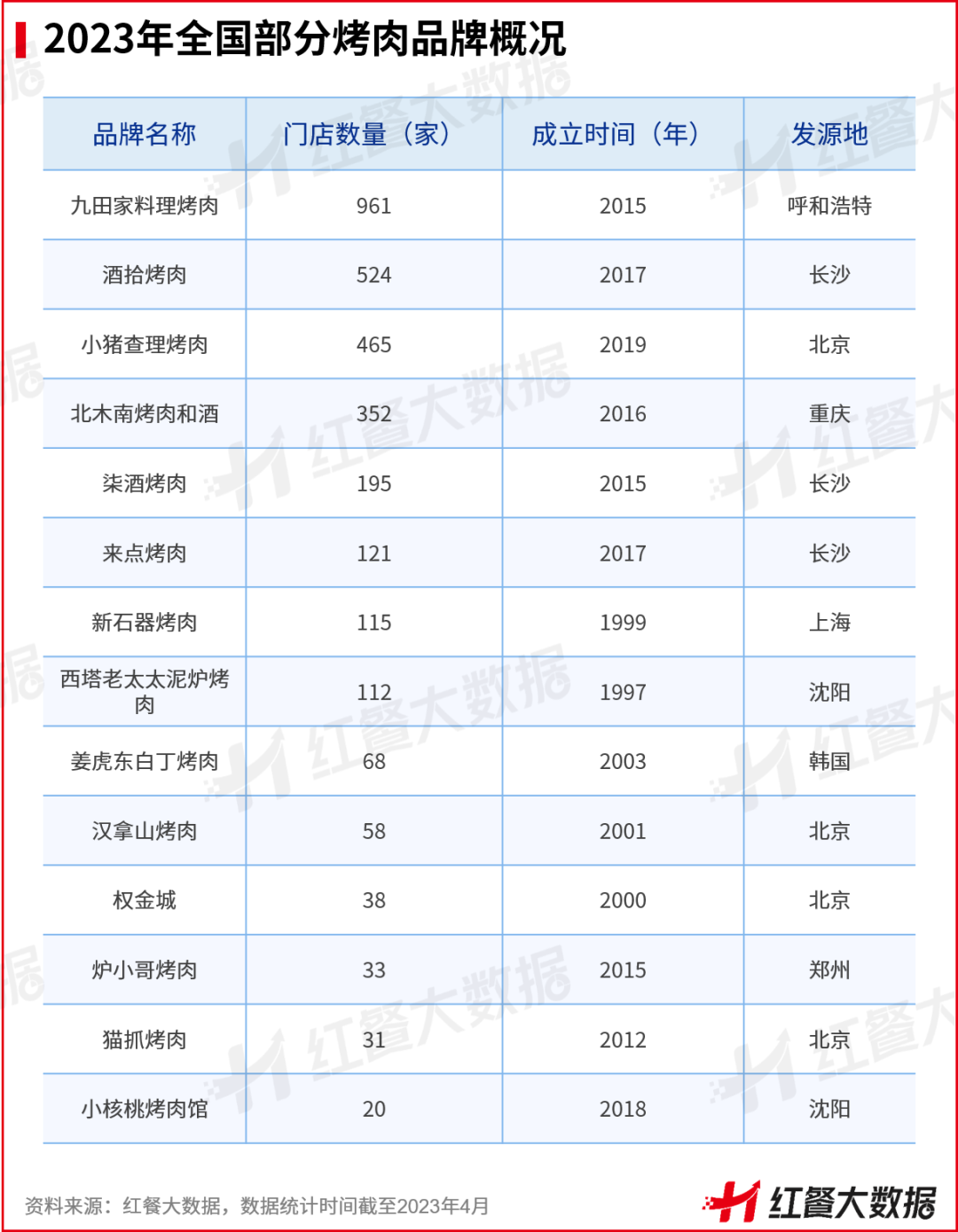 從品牌競爭格局上看,目前烤肉品類呈現(xiàn)“一超多強”的局面,而烤串品類暫無絕對的巨頭品牌。2015年起家于呼和浩特的九田家料理烤肉是門店數(shù)量最多的燒烤品牌。據(jù)紅餐大數(shù)據(jù),截至2023年4月,其門店數(shù)達(dá)到了961家,遠(yuǎn)超其他烤肉品牌。