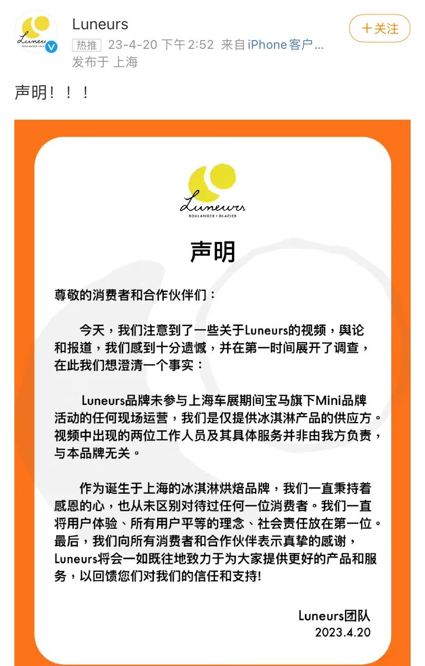 4月20日,網(wǎng)傳2023上海車展上寶馬mini展臺區(qū)別對待中外咨詢者,發(fā)放冰激淋給外國人卻對中國人說發(fā)放完沒有了,此舉被網(wǎng)友曝光后,#寶馬mini展區(qū)被指區(qū)別對待#等多條負面詞條登上微博熱搜。