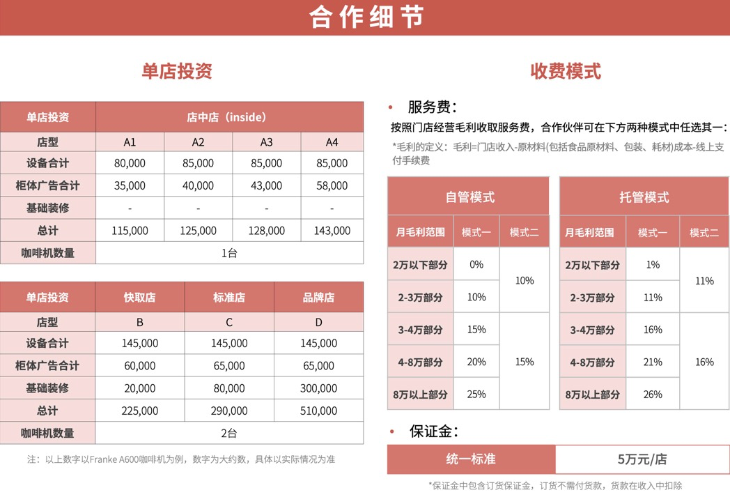 根據(jù)其官網(wǎng)的介紹,庫迪咖啡共有店中店、快取店、標準店、品牌店和戶外店五種業(yè)態(tài),根據(jù)不同業(yè)態(tài),合作加盟標準和費用也不同。門檻最低的店中店,單店投資在11.5萬-14.3萬之間;快取店的投資費用為22.5萬,標準店為29萬,門檻最高的品牌店則需要51萬。此外,加盟商還需繳納保證金和設計費,保證金統(tǒng)一標準5萬/店,設計費為2000元至8000元不等。