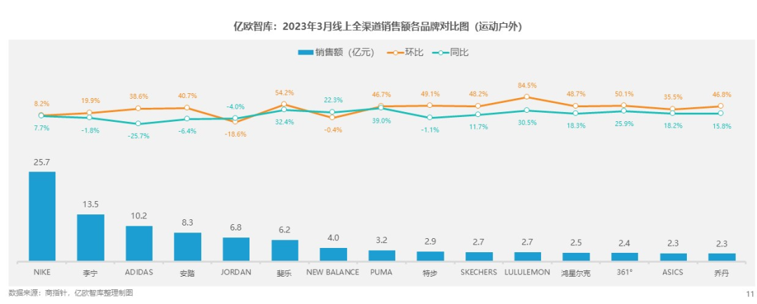 隨著中國全民健身意識的提升,國貨運(yùn)動品牌快速把握了體育消費(fèi)持續(xù)增長的態(tài)勢,以強(qiáng)勁的發(fā)展實(shí)力向市場主導(dǎo)地位進(jìn)軍!秷蟾妗窋(shù)據(jù)顯示,3月,線上渠道銷售額排在第二和第四的分別是李寧和安踏,環(huán)比增長分別為19.9%和40.7%。