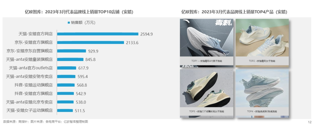 其線上銷量TOP10店鋪以天貓為主,并活躍于京東、抖音等各平臺旗艦店、專賣店與網(wǎng)店。安踏線上銷量TOP4產(chǎn)品分別為:安踏毒刺4代男子跑鞋、安踏毒刺女子跑鞋、安踏C37減震軟底女子跑鞋、安踏綿綿彈2跳繩跑鞋。