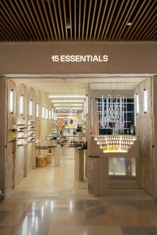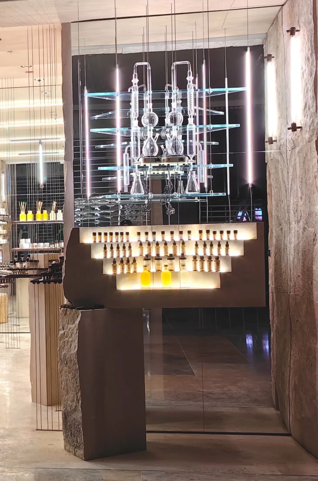 首店內(nèi)部以大理石和木板為主要元素,以乳白色和咖色為主色調(diào),正如主打產(chǎn)品精油般給人一種溫馨舒適的感覺。有意思的是,門店入口處擺放著一套化學(xué)器材裝置,為整個門店增添了趣味。