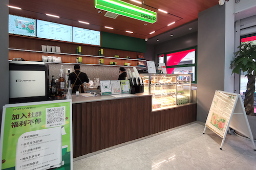 據(jù)官方介紹,該店面積400平方米,分為線上展示區(qū)、咖啡售賣區(qū)、郵政營業(yè)區(qū)、文創(chuàng)展示區(qū)、眾創(chuàng)共享區(qū)等五個區(qū)域。首店內(nèi)陳設(shè)以咖色木制裝置為主,一些地方以綠色作為點綴,清新舒適。