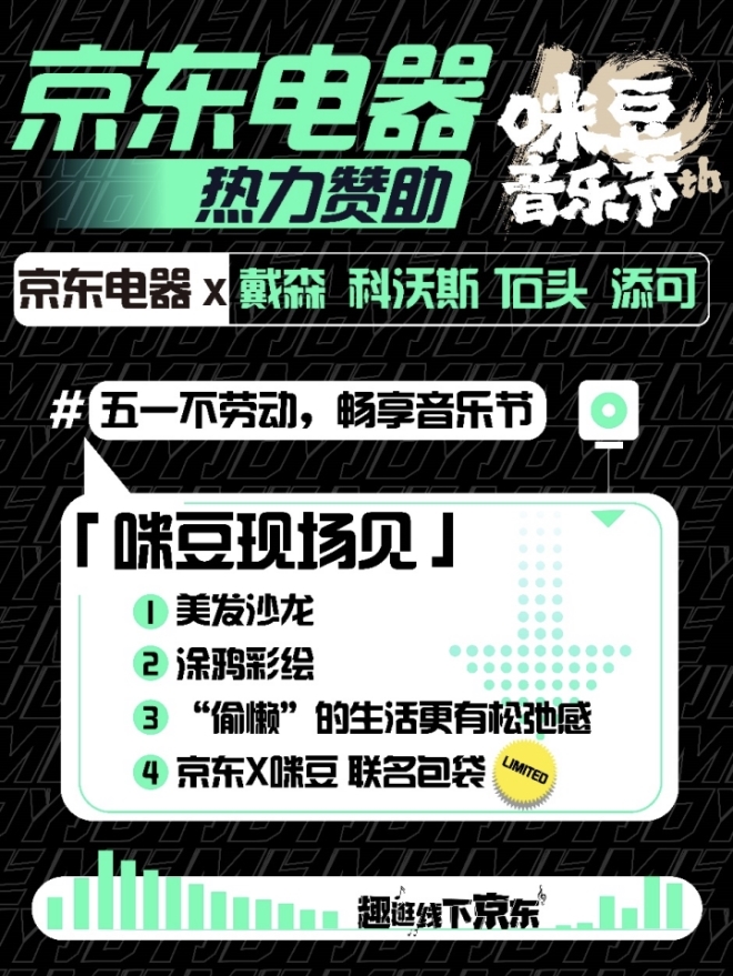 咪豆現(xiàn)場,京東五星電器運(yùn)營的京東電器線下門店將聯(lián)合戴森、科沃斯、石頭、添可等科技小家電品牌,為現(xiàn)場樂迷帶來“美妝”和“清潔”的新體驗(yàn)。樂迷參與@京東五星電器 小紅書及微博官方賬號(hào)互動(dòng)還能贏取門票和咪豆聯(lián)名包袋。