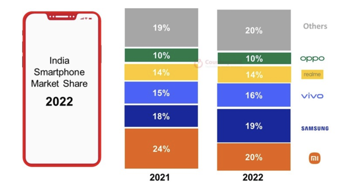 △ 小米、三星、vivo、realme(oppo旗下)、oppo是印度智能手機(jī)市場(chǎng)前五大品牌。(圖源:Canalys)