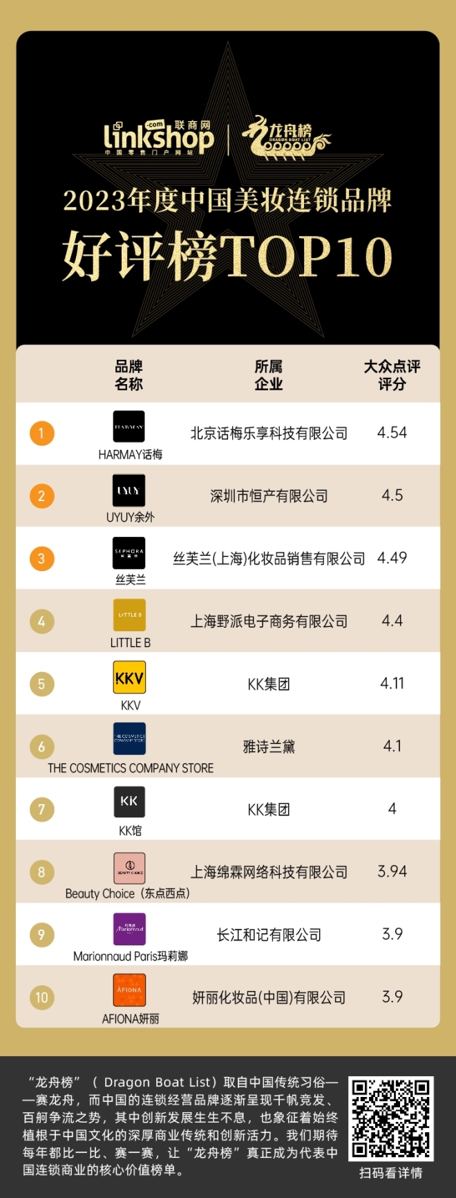 本期,《聯(lián)商網(wǎng)》評選出龍舟榜之“2023年度中國美妝連鎖品牌TOP20”,以門店數(shù)量為標準,輔以消費者好評度、融資情況,同時結(jié)合了多位行業(yè)人士的看法,以此探索美妝賽道的發(fā)展趨向。