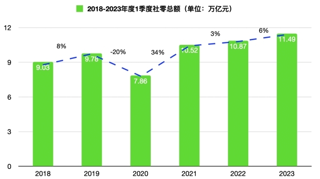 圖1 2018-2023年一季度社零總額及趨勢(shì)變化