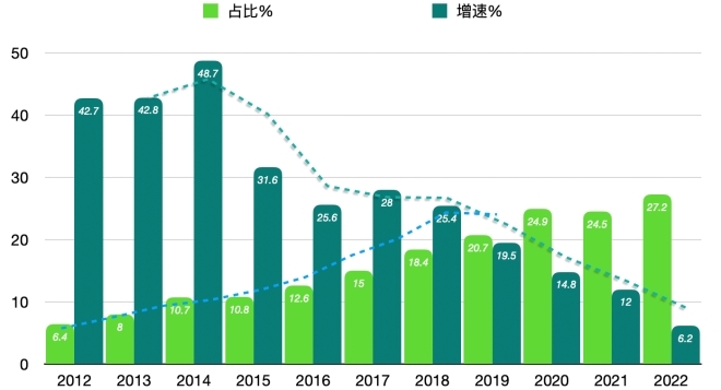 2022年的電商占比最后定格在27.2%。也為十年前開(kāi)始的那場(chǎng)關(guān)于電商能否突破50%的馬王之賭畫(huà)上了句號(hào)。2023年一季度的電商占比為24.2%,也是近年一季度一個(gè)較高的電商占比。但是隨著國(guó)內(nèi)電商規(guī)模的不斷擴(kuò)大,電商的增長(zhǎng)速率已經(jīng)明顯放緩。圖3為根據(jù)歷年統(tǒng)計(jì)公報(bào)對(duì)2012年到2022年的電商增長(zhǎng)率和占比的統(tǒng)計(jì)曲線。由圖3可見(jiàn),雖然2022年電商滲透率達(dá)到27.2%的歷史新高,但電商的增速已經(jīng)降至6.2%。